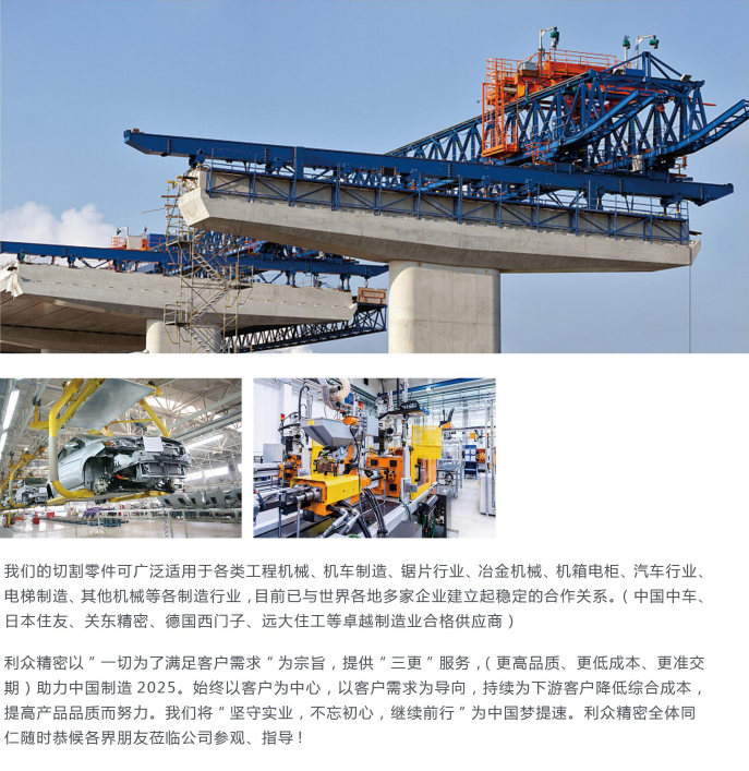 唐山市利眾精密制造有限公司創立于2007年4月,注冊資本金2000萬元,是佳源集團的直屬分支機構,專注于鋼材、有色金屬等板材的切割、成型及焊接加工。公司采用的科學計算機套料系統和計算機報價系統,有效的提高了切割件的成材率和報價的透明度。利眾精密憑借數控切割設備和豐富的加工生產經驗,以合理出廠價格為基礎,在保證產品質量、交貨期及優質售后服務的前提下,為客戶提供全面的鋼材深加工服務。